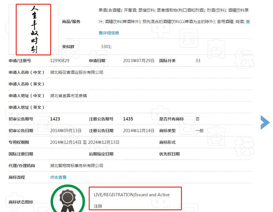 作为广告语,“人生丰收时刻”之所以能在第33类“酒精饮料”等商品上获准注册的原因在于,其具有较强的独创性,与酒商品行业通常使用的宣传用语区别较大,故相关公众能够将该短语作为商标对待,通过其识别商品来源。因此,“人生丰收时刻”自身具有显著性。